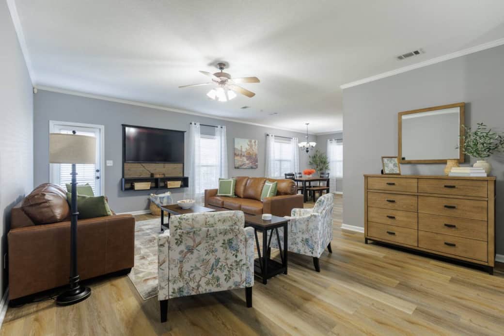 Modern 3 BR / 2 BA home in central Valdosta! Minutes from VSU, South Georgia Medical Center & Downtown. Enjoy an open living area with 65″ TV, fully equipped kitchen & outdoor dining on the porch. Peaceful king & queen beds ensure restful nights. Perfect for families, visiting parents, and traveling workers seeking a stylish boutique stay close to everything.